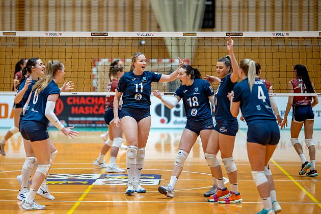 Domácí: Deisl, V. Dvořáková, Bažó, Jasečková, Cruz, Makoňová, libero Slavíková.