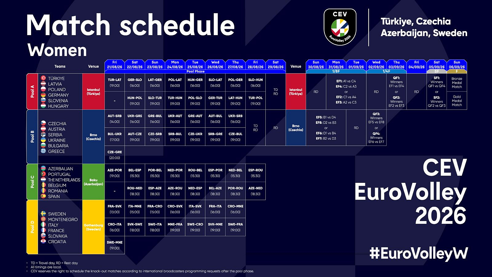 Herní plán základní skupiny B, osmifinále a čtvrtfinále EuroVolley 2026 v Brně: