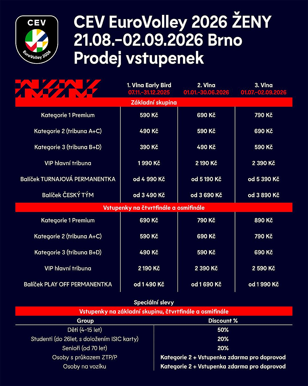Kromě 15 utkání základní skupiny B se na evropském šampionátu volejbalistek v Brně odehrají i 4 osmifinálové a 2 čtvrtfinálové duely. Vstupenky na všech 21 zápasů budou moci fanoušci koupit už od pátku 7. listopadu v síti Ticketportal na adrese www.ticketportal.cz/event/CEV-EuroVolley-2026-Women. „Vstupenky budeme prodávat ve třech fázích, kdy ty nejlevnější budou dostupné do konce letošního roku. Fanoušci by tak rozhodně neměli s nákupem váhat. Navíc co může potěšit víc než obálka s lístky na volejbal pod vánočním stromečkem,“ napověděl Lukáš Kozáček, člen organizačního týmu EuroVolley 2026. „Zájemci si můžou vybrat ze tří cenových variant, kdy nejlevnější sedadlo na utkání základní skupiny koupí už za 390 korun. Velkým bonusem je, že vstupenky platí na všechna utkání daného dne. Pro volejbalové nadšence nabízíme i permanentky, takže skalní příznivci našeho sportu si můžou koupit celoturnajový lístek, vstupné na všechna utkání českého týmu nebo takzvaný play off balíček,“ vysvětlil Lukáš Kozáček. Vstupenky pochopitelně nejsou určeny pouze českým fanouškům a pořadatelé očekávají velký zájem příznivců srbského, rakouského nebo ukrajinského týmu. V pátek 7. listopadu zahájí prodej všechny čtyři spolu-pořadatelské federace turnaje CEV EuroVolley 2026 žen. Kromě Česka budou šampionát hostit i Turecko, Švédsko a Ázerbájdžán.