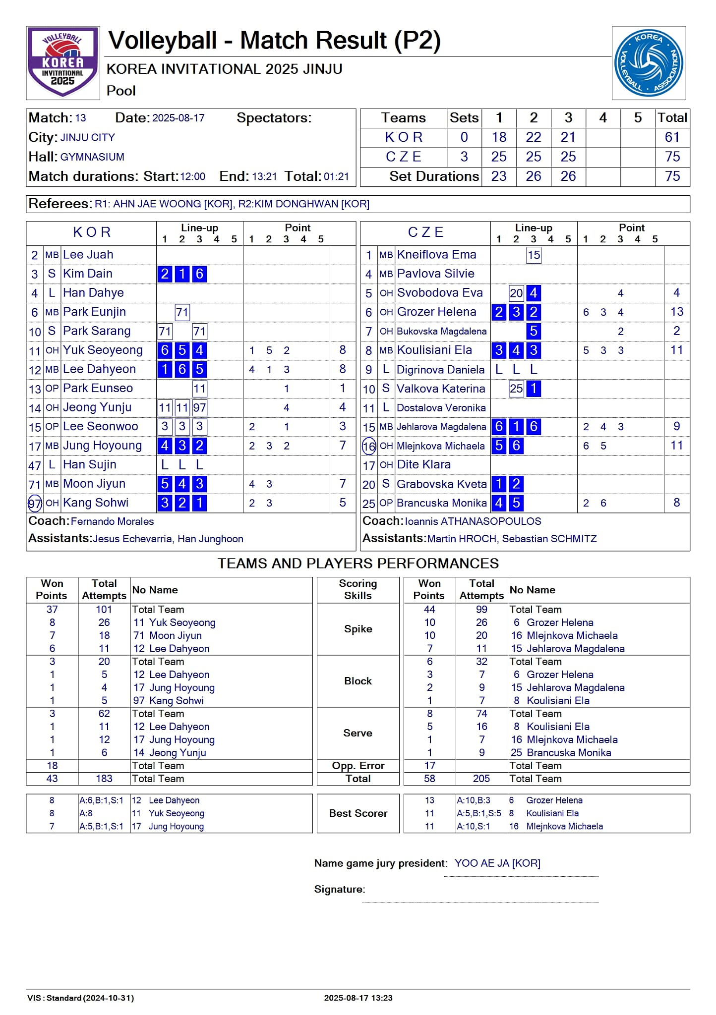 Jižní Korea – Česko 0:3 (18:25, 22:25, 21:25)